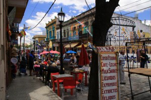 Ganz begeistert waren wir von Stadtteil La Boca. In dem ursprünglichen Arbeiterviertel gab es einst viele Konservenfabriken und Lagerhäuser, wo das für Argentinien lebenswichtige Rindfleisch verarbeitet wurde. Die Hafenbewohner nutzen die restliche Farbe mit der die Hafenkräne aufgemöbelt wurden, um die Wellblechwände ihrer Häuser zu verschönern – daraus entstand dann das heutige bunte Künstlerviertel, mit vielen Cafés und Kneipen, die teilweise ihre Tangoshows feilbieten.